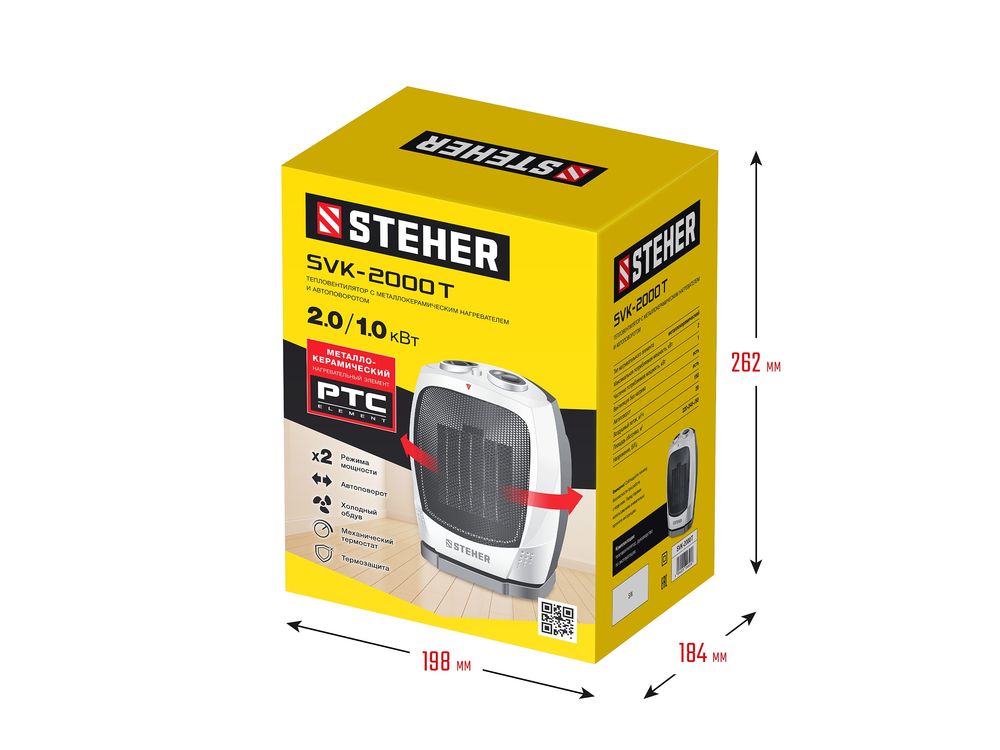 Тепловентилятор STEHER SVK оснащен высокоэффективным металлокерамическим нагревательным элементом 2000 Вт.Мгновенно обогревает помещение площадью до 20 м. Тепловентилятор отличается пониженным уровнем шума в процессе работы, что делает его использование максимально комфортным. Режим вентиляции без обогрева позволяет использовать прибор и летом в качестве обычного вентилятора. Возможность регулирования, как мощности, так и температуры нагрева воздуха позволяет создать наиболее комфортный микроклимат в помещении. Благодаря уникальному авторскому дизайну тепловентилятор станет украшением любого интерьера.