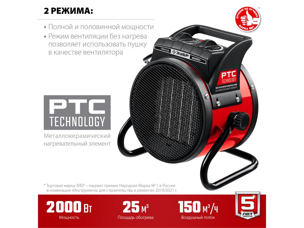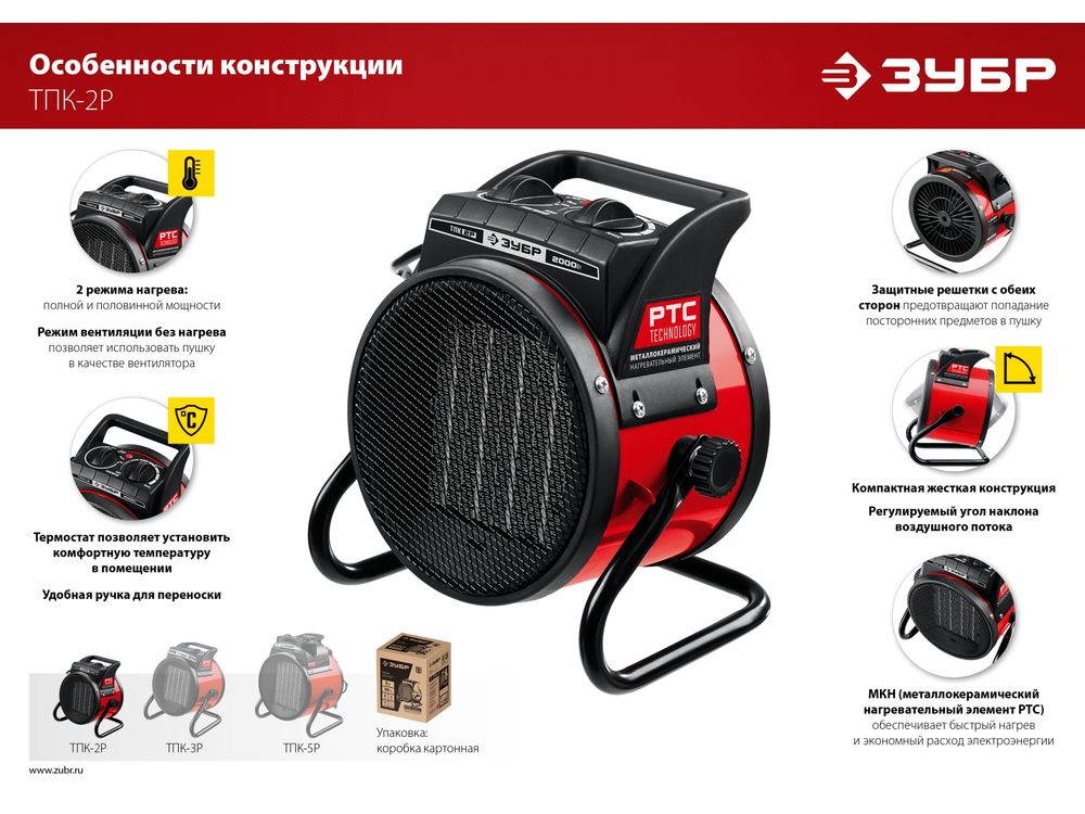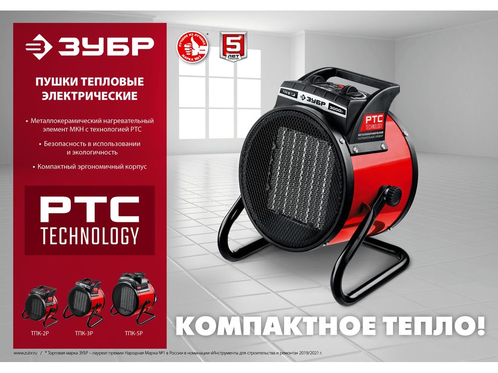 Электрические тепловые пушки ЗУБР серии ТПК–Р компактные пушки в круглом корпусе для обогрева небольших помещений. Благодаря небольшим размерам тепловую пушку легко переносить и хранить. Устройства оснащены долговечным металлокерамическим нагревательный элементом, обеспечивающий быстрый равномерный нагрев, экономное потребление электроэнеергии и не сушит воздух. Механический терморегулятор поддерживает нужную температуру нагрева. За счет большой площади теплообмена и небольшой температуры нагрева элемента, воздух быстро прогревается. Изделие можно оставлять на долгое время и не бояться за сохранность помещения, так как конструктивные меры безопасности защищают Вас и изделие при нештатных ситуациях.