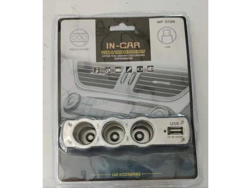 Автомобильные принадлежности Разветвители для прикуривателя Разветвитель автомобильный 12/24 вольта 3 выхода +1 usb 500mA-1930