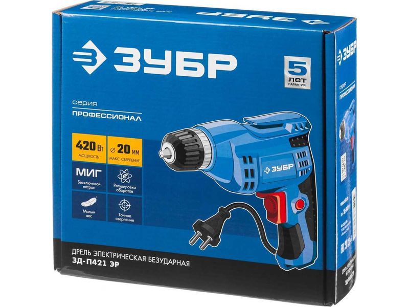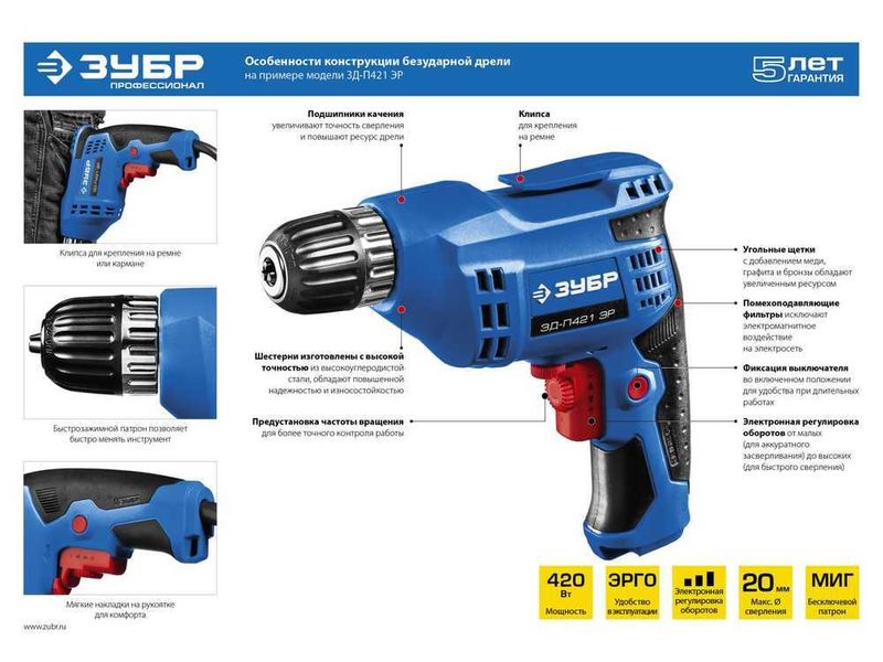 Электронная регулировка оборотов от малых (для аккуратного засверливания) до высоких (для быстрого сверления)