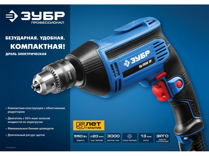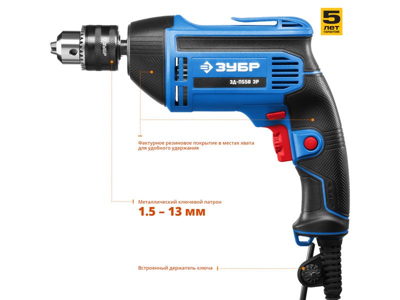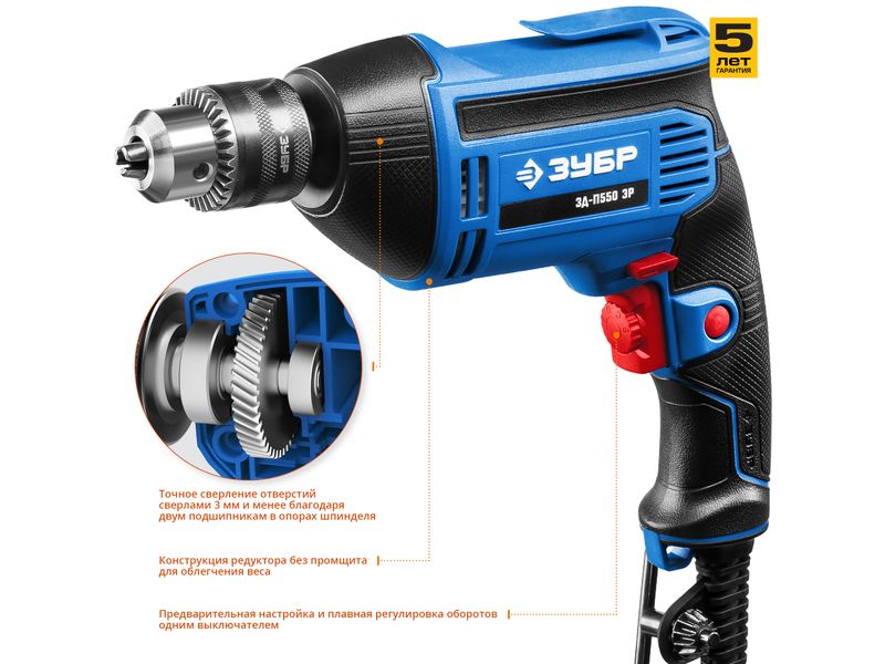 Электронная регулировка оборотов от малых (для аккуратного засверливания) до высоких (для быстрого сверления)