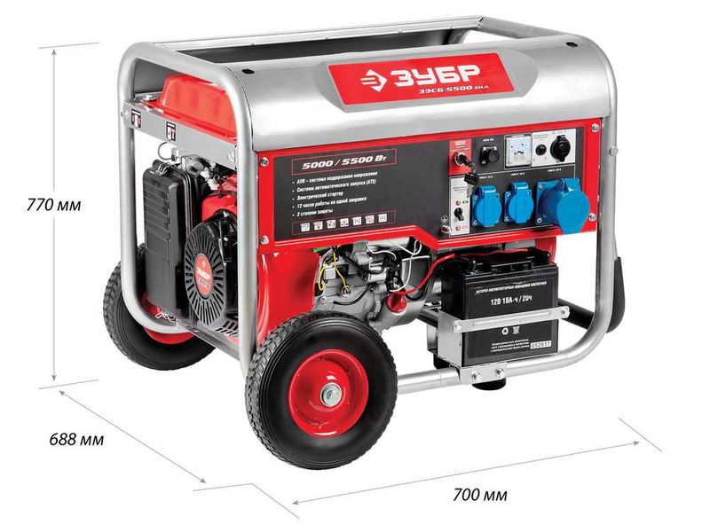 Генератор ЗУБР бензиновый, 4-х тактный, ручной и эл пуск, колеса + рукоятка, автоматический пуск, 220/12В, 5500/5000Вт