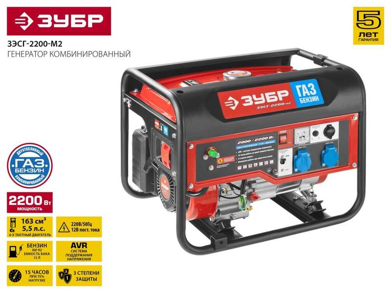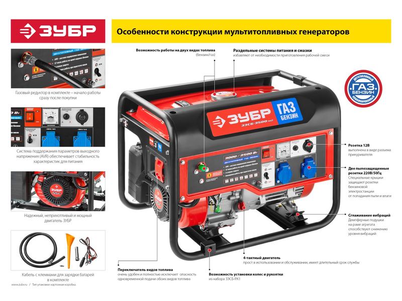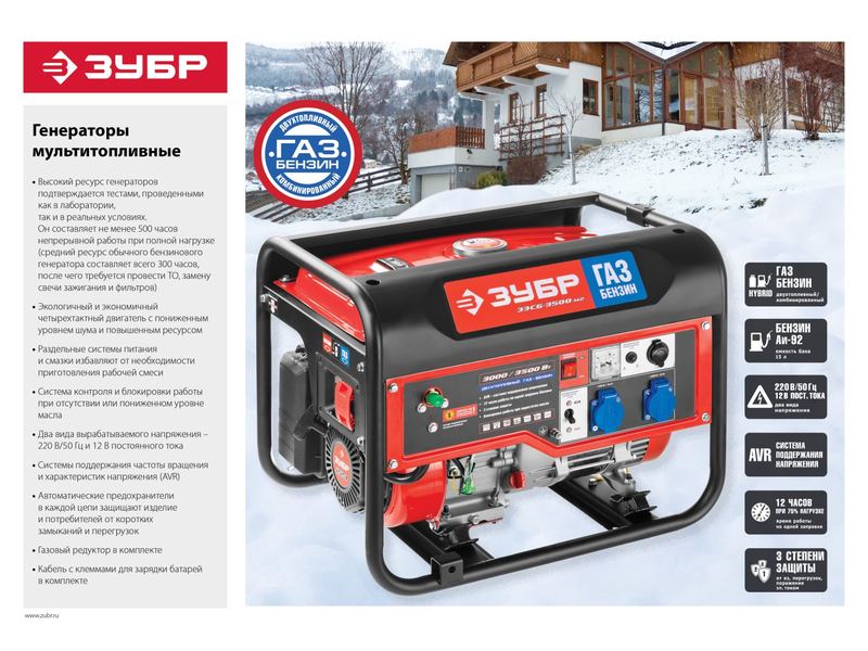 Возможность работы на двух видах топлива (бензин/газ) существенно увеличивает автономность и удешевляет стоимость электроэнергии (при работе на газу);