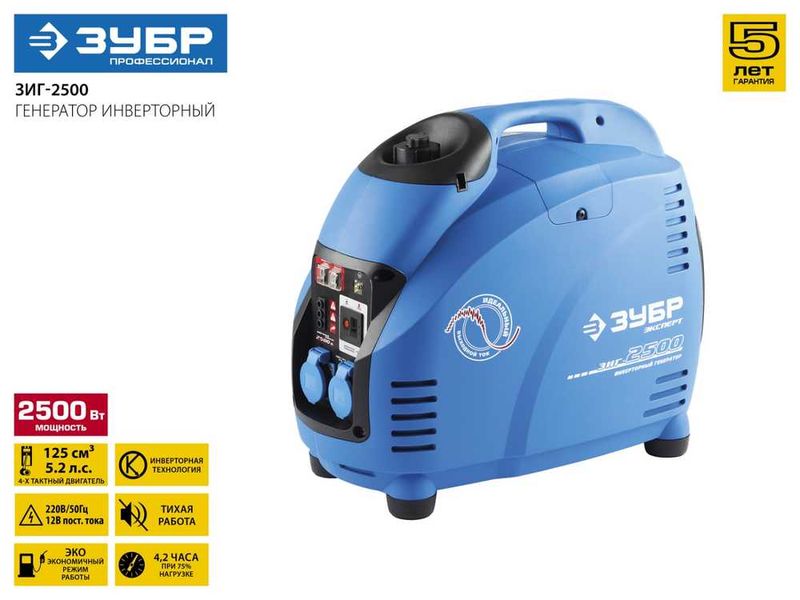 Купить Генератор ЗУБР инверторный, однофазный (220В), 4-тактный, низкий уровень шума, с-ма Эл-интелект, 2500/2200Вт