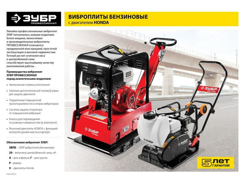 Купить Виброплита ЗУБР "ПРОФЕССИОНАЛ" реверсивн хода, бензин, 25кН, плита 630*400мм, двигатель Honda GX160, 4.0кВт(5.5л.с.), 15м/мин, 126кг