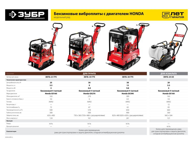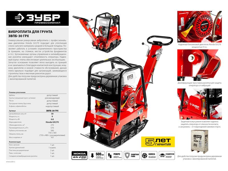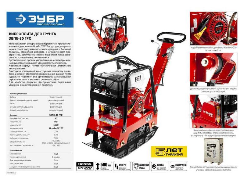 Серьезные технические характеристики и высококачественные конструкционные материалы позволяют работать эффективнее, а благодаря колесам, облегчающим транспортировку, и эргономичной рукоятке ежедневная работа с виброплитой будет простой и удобной. Встроенный реверс, специальная форма плиты позволит работать в самых недоступных местах с высоким уровнем качества. Четырехтактный двигатель "Honda" обеспечит беспроблемную эксплуатацию на весь срок службы